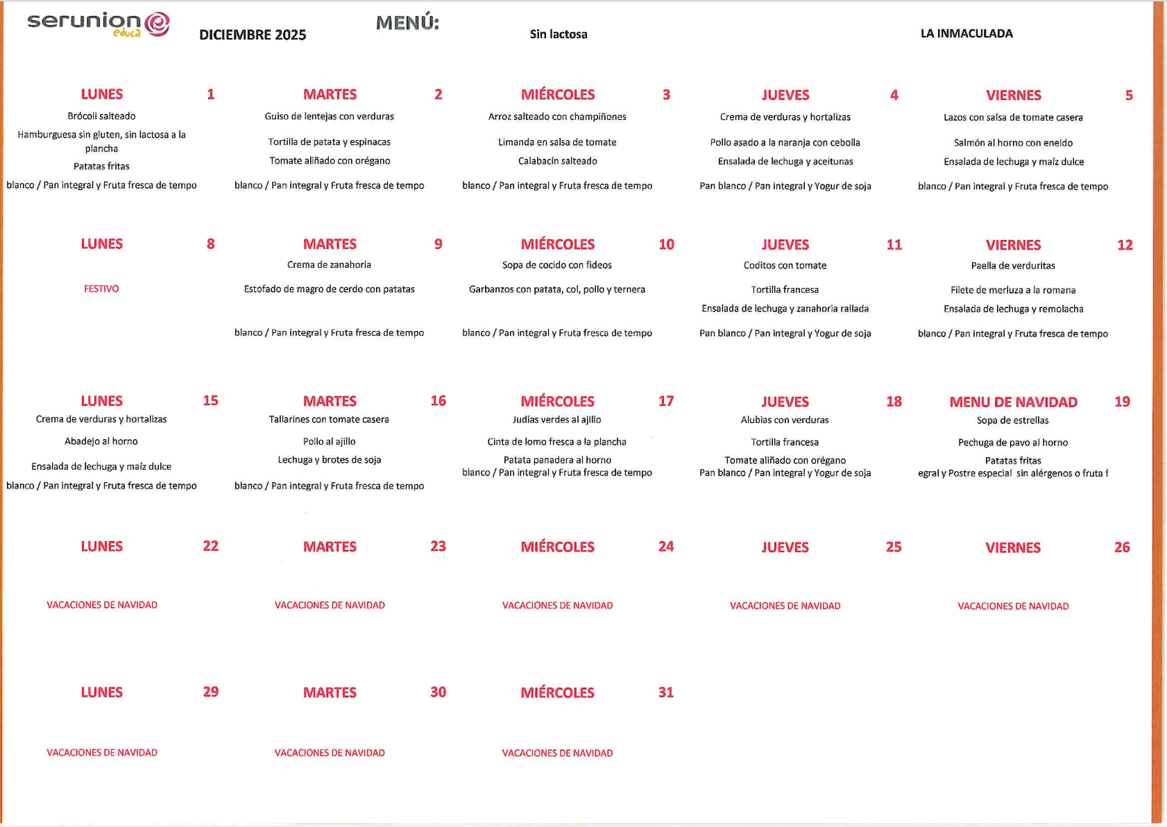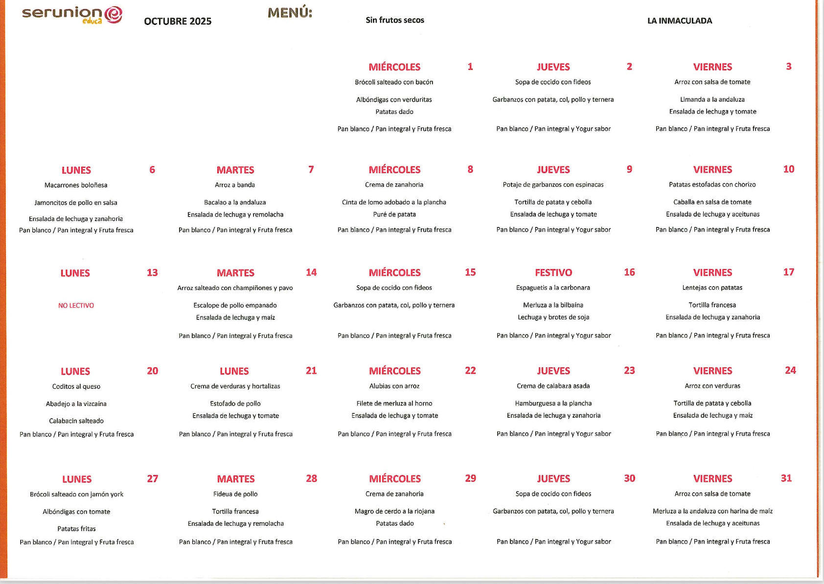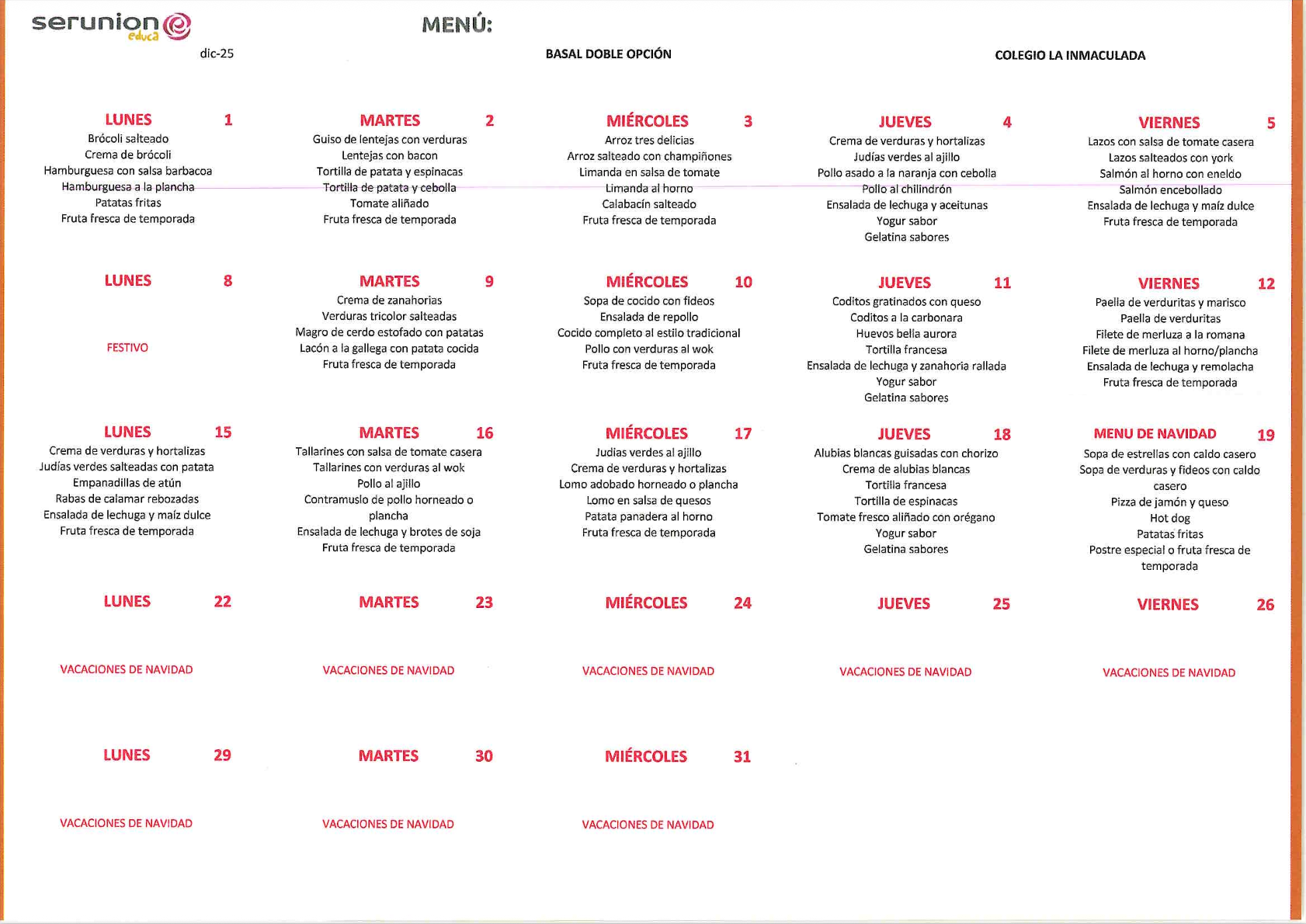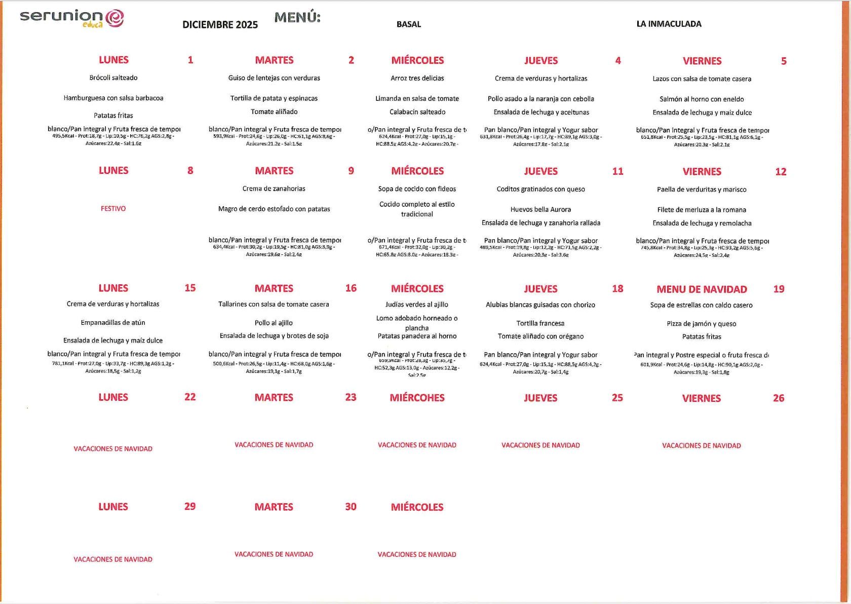 Como empresa responsable del comedor escolar de su centro, SERUNION EDUCA vela por cuidar diariamente a su alumnado con una alimentación saludable y un proyecto educativo didáctico y divertido en línea con el ideario de ESCOLAPIAS.